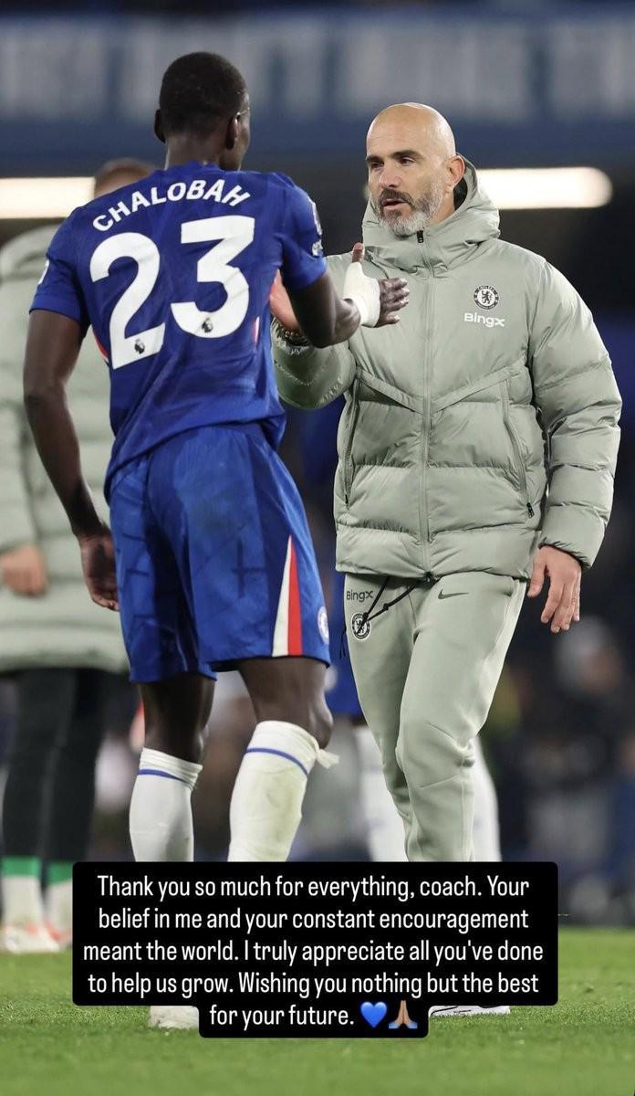 在切尔西官方宣布主帅马雷斯卡离任后,切尔西后卫特雷沃-查洛巴在社交媒体发文告别马雷斯卡。