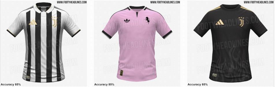 尤文图斯将在下赛季发布一款非常优雅的主场球衣,以白色、黑色和金色为主色调,并配有Polo领。客场球衣为粉色搭配黑色和白色,第三球衣则为黑金配色。