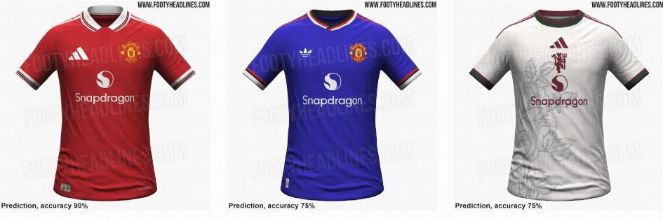 曼联下赛季客场球衣主色调为亮眼的皇家蓝,并以红白两色点缀;第三球衣则采用了米白色设计,带有大面积的玫瑰印花和居中队徽。